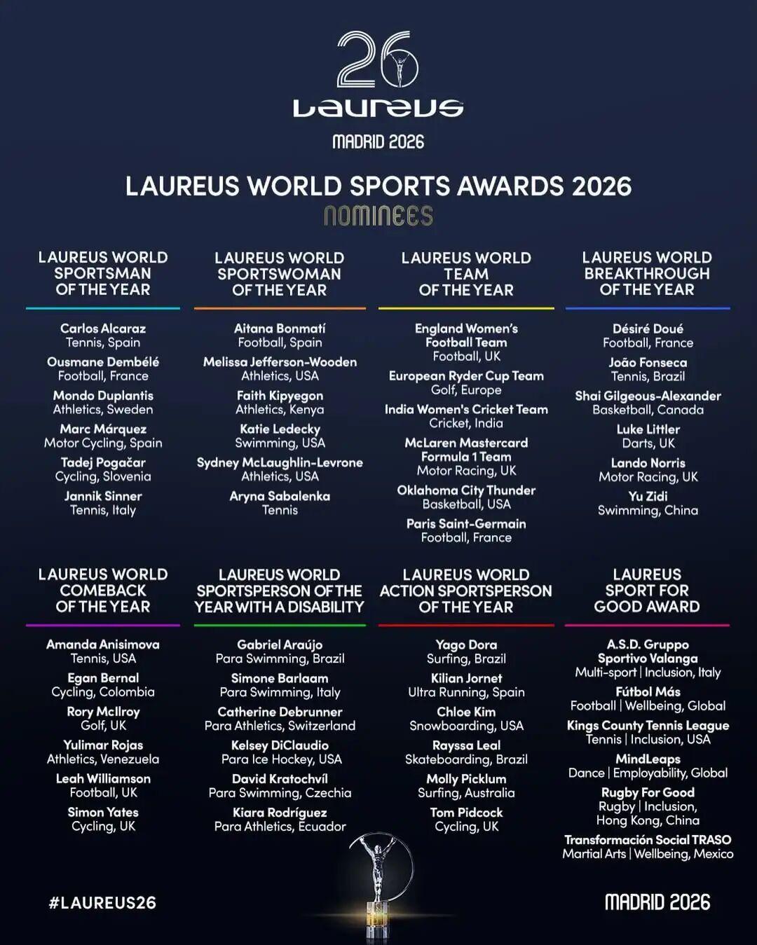 3月3日,2026年劳伦斯世界体育奖评选提名名单公布。